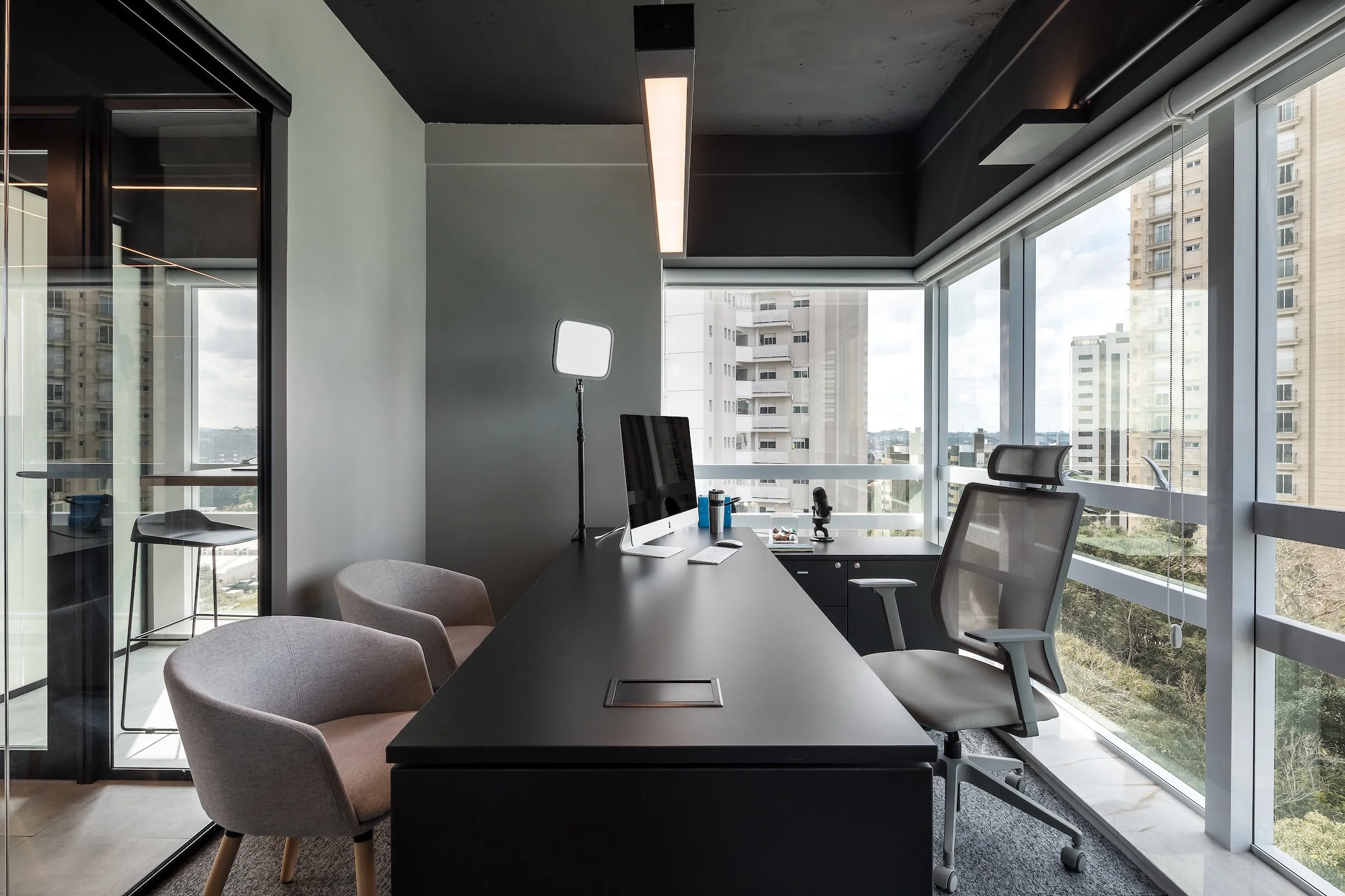 O novo escritório seria instalado em uma nova sala comercial de aproximadamente 150m2, um imóvel extremamente agradável, com três fachadas envidraçadas que inundam a sala de luz natural e propiciam uma excelente ventilação cruzada.