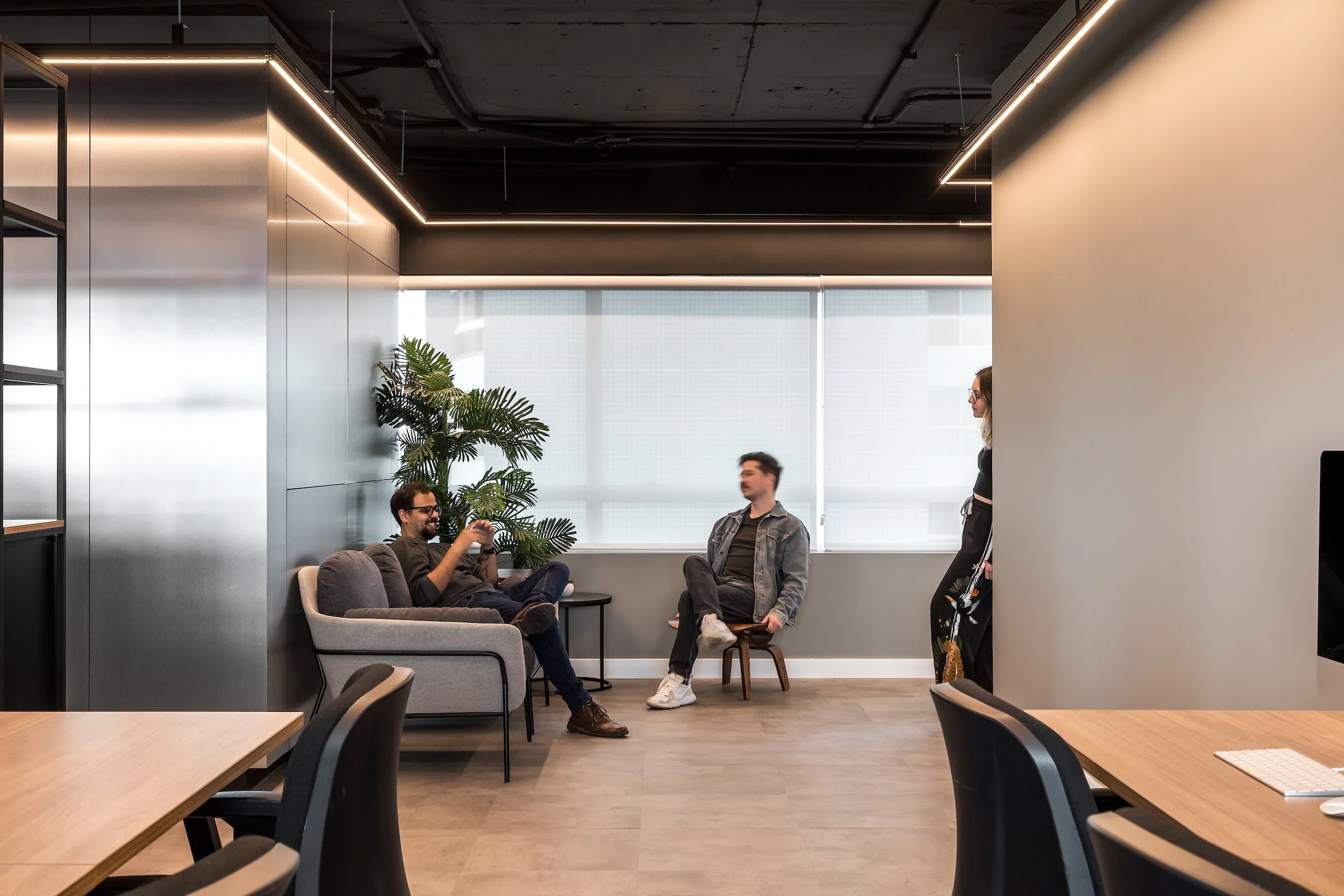 O destaque do projeto fica por conta dos painéis de aço inoxidável que envelopam o volume de apoio dos banheiros e copa. Esse material, além de fortalecer o aspecto industrial desejado pelos clientes, também cria interessantes reflexos conforme o usuário se move pelo espaço.